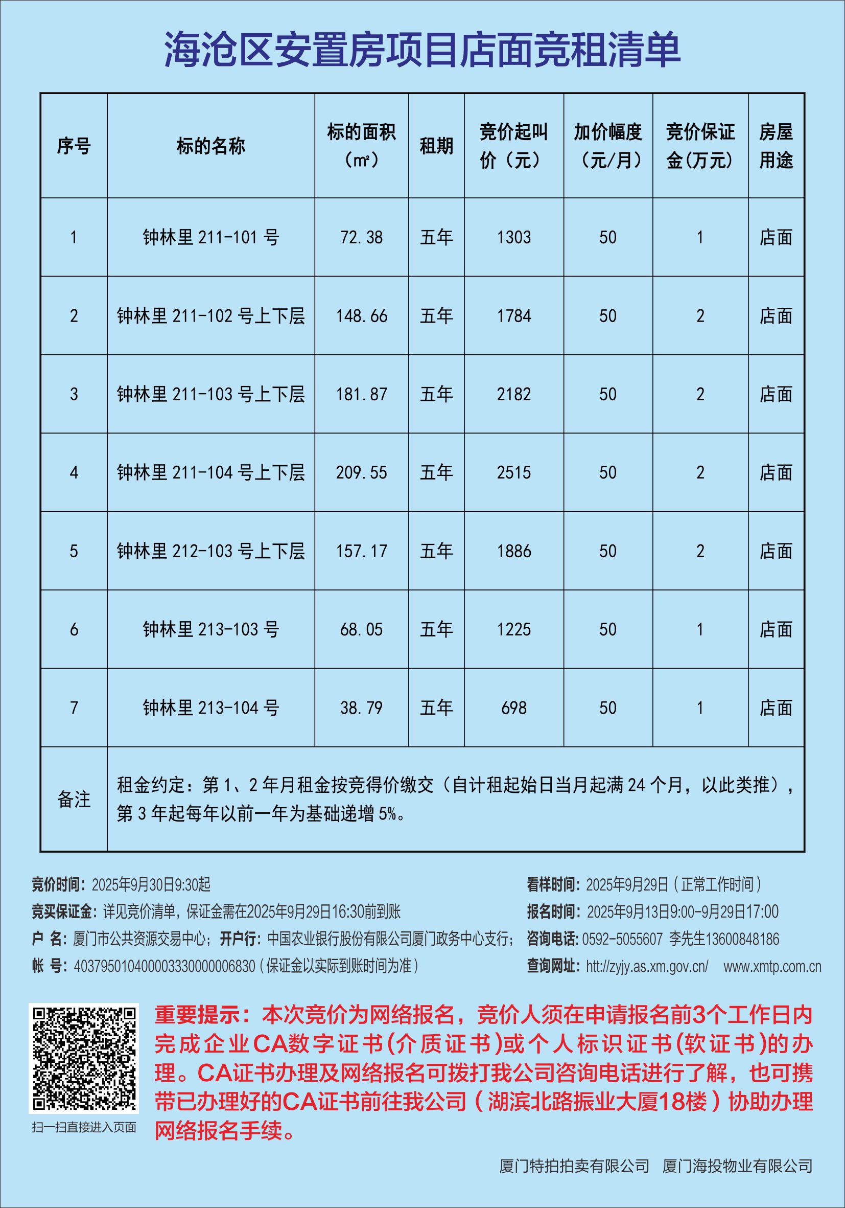 受委托,定于2025年9月30日9:30起在厦门市资产资源交易系统(http://120.41.41.16:9101/)举办:“海沧区安置房项目店面竞租”竞价会,具体资格条件详见厦门市公共资源交易网。