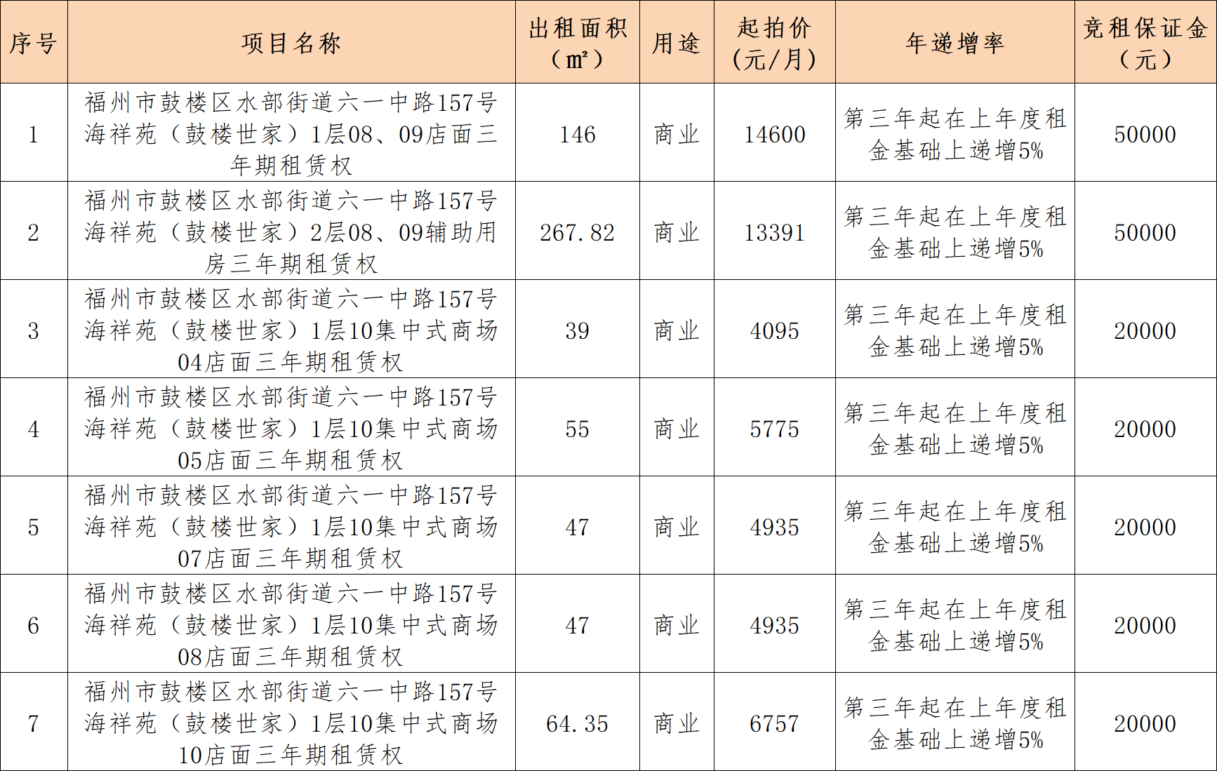 兹定于2025年10月28日上午10时在中拍平台(https://paimai.caa123.org.cn/)举行房地产租赁权拍卖会。拍卖标的:福州市鼓楼区水部街道六一中路157号海祥苑(鼓楼世家)1层08、09店面;2层08、09辅助用房及1层10集中式商场04、05、07、08、10店面的三年期租赁权,以上七项标的逐项拍卖,标的具体信息详见以下清单。