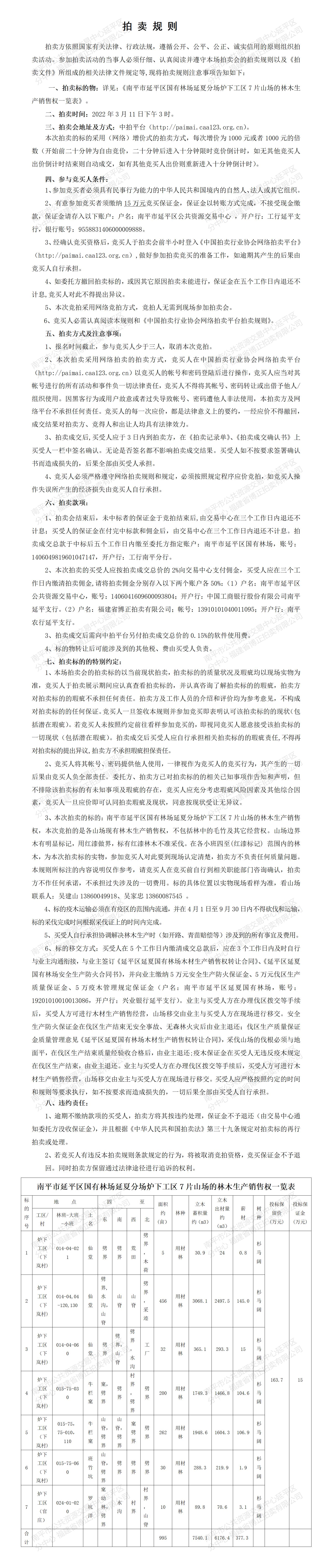 一、拍卖标的:南平市延平区国有林场延夏分场炉下工区7片山场的林木生产销售权(采伐类型:主伐,采伐方式:皆伐;采伐面积995亩,总蓄积量约7540.1m³,出材量约6176.4m³,出材量中含疫木约542.1m³,薪材约377.3吨。)整体拍卖,总起拍价为¥163.7万元。