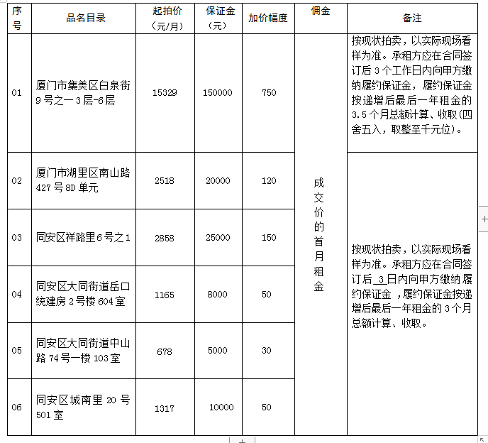 受委托,定于2022年7月25日9:30在中拍平台(http://paimai.caa123.org.cn)公开招租:集美区白泉街9号之一3层-6层、湖里区南山路427号8D单元、同安区祥路里6号之1等6处房产租赁权。保证金缴交及报名截止时间:2022年7月22日17时(以保证金实际到账为准)以上标的即日起可预约看样 垂询热线: 0592-5055607 / 2277055报名地点:厦门市湖滨北路108号振业大厦18楼公司网址:www.xmtp.com.cn