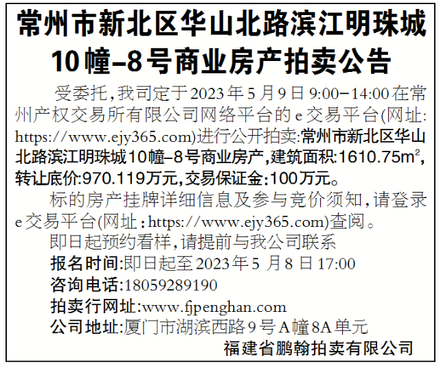 常州市新北区华山北路滨江明珠城10幢-8号商业用房拍卖公告(国资监测编号GR2023JS2000609-2)https://www.ejy365.com/info/ejy86560