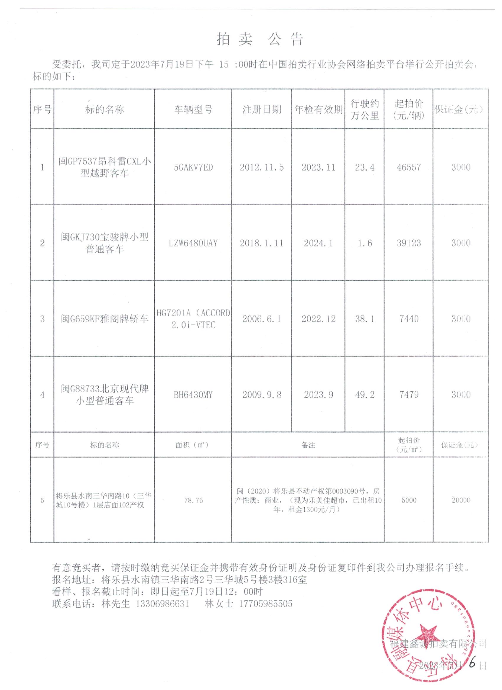 鑫诚拍卖20230719拍卖会公告
