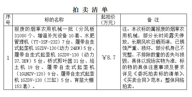 一、拍卖标的:报废的烟草农用机械一批,详见(拍卖清单)。