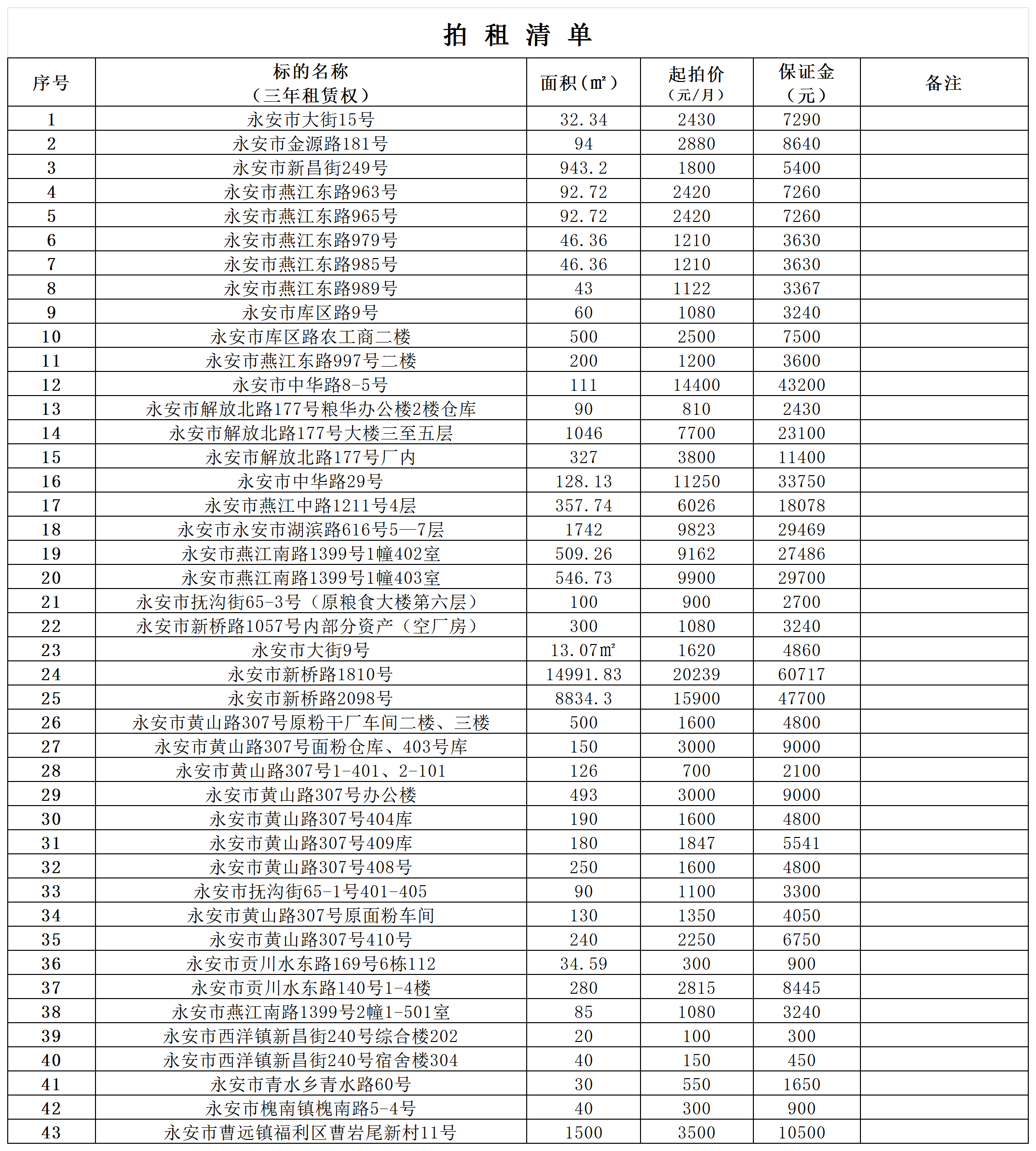 受委托,我公司定于2026年4月21日10时在永安市建融花园1幢二层及中拍平台(https://paimai.caa123.org.cn/)对以下标的进行公开拍卖,公告如下: